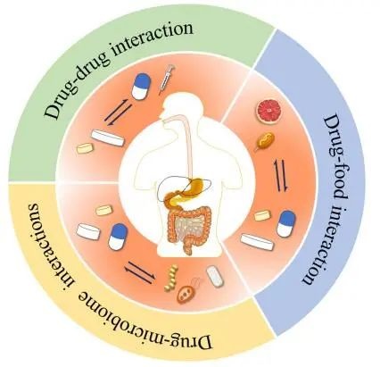 体内药物相互作用包括DDI、DFI和DMI 。药物在体内吸收、分布和代谢后,其疗效可能会发生变化。在肝脏中,药物或食物可以用作P450酶的抑制剂或诱导剂,以影响药物代谢。在胃肠道中,药物及其代谢产物、药物或药物代谢产物与食物之间可能存在多种相互作用。在肠道中,微生物与药物或药物代谢产物相互作用,影响药物代谢或药物作用