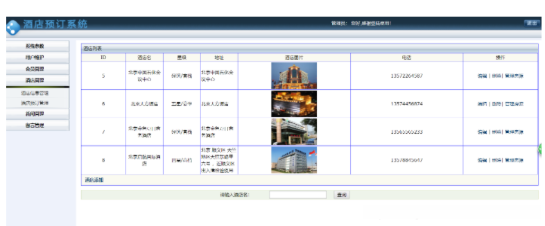 系统参数、用户维护、会员管理、酒店管理、新闻管理、留言管理等。