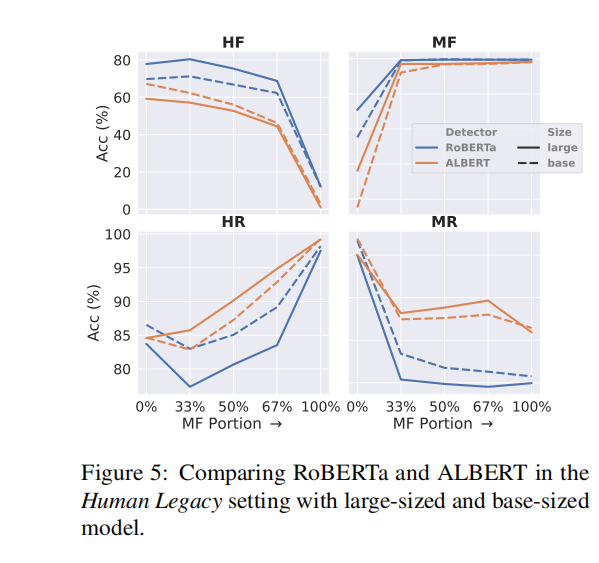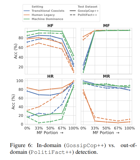 随着MF比例的增加,检测器对机器生成的假新闻(MF)的识别准确性显著提升,表现出对机器生成文本特征的敏感性。然而,对人类编写的假新闻(HF)的检测准确性随着MF比例的增加而下降,这可能提示检测器过度适应了机器生成文本的特征。此外,对机器仿写的真实新闻(MR)的检测准确性通常会下降,这可能与检测器将MR与MF混淆有关,因为两者本质上都是机器生成的。最后,对人类编写的真实新闻(HR)的检测准确性可能会有所提升,因为HR与MF在风格和特征上存在显著差异。