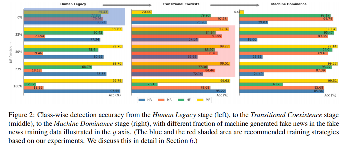 - 机器主导阶段 :在绝大多数情况下,检测器对机器生成假新闻(MF)的检测性能达到极高水平,但对人类编写内容的检测性能则相对较低。