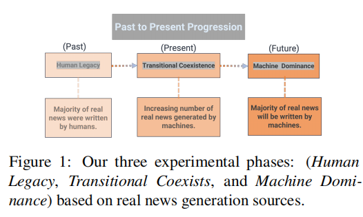 - 人类遗产阶段:在这一阶段,全部真实新闻训练数据均由人类编撰,假新闻训练数据逐步引入机器生成内容,比例从零提升至100%。