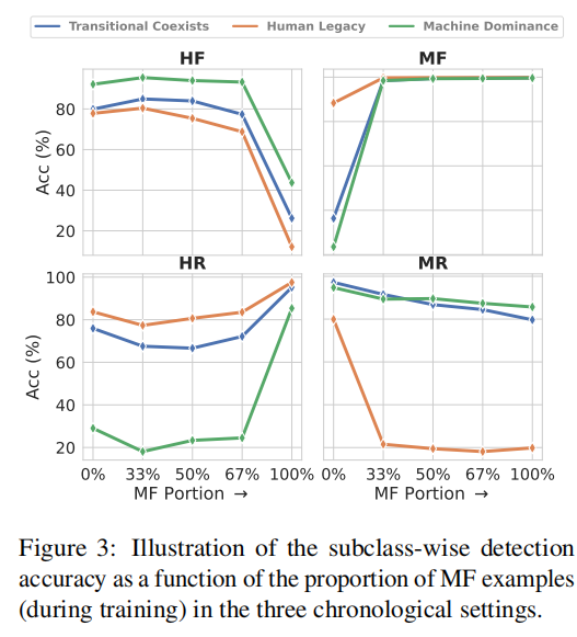 在过渡共存阶段,真实新闻和假新闻的训练数据集整合了人工编写与机器生成的内容。实验结果表明,当机器生成内容(MF)在假新闻训练数据中的比例较高时,检测器能够有效识别机器生成的假新闻,但对人工编写内容(HF)的检测准确率明显下降。这一现象可能源于检测器在训练过程中倾向于将机器生成文本的特征与假新闻内容相关联的学习倾向,这可能导致其在未接触过足够多人工编写假新闻样本的情况下,识别能力显著下降。
