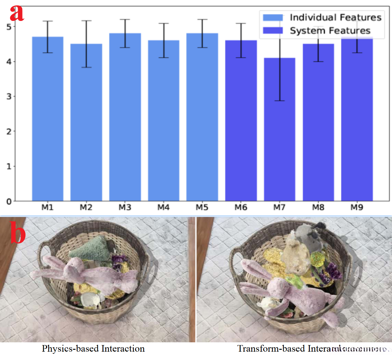 (a) personality ( __M1-M5: manipulation of objects in various scenes and enhancing lighting effects through motion aspects within the physical framework __ ) and system response ( M6-M9: The intuitiveness of operation across different scenarios with minimal processing delay for a wide range of operational features to ensure a sense of fulfillment from interaction. )