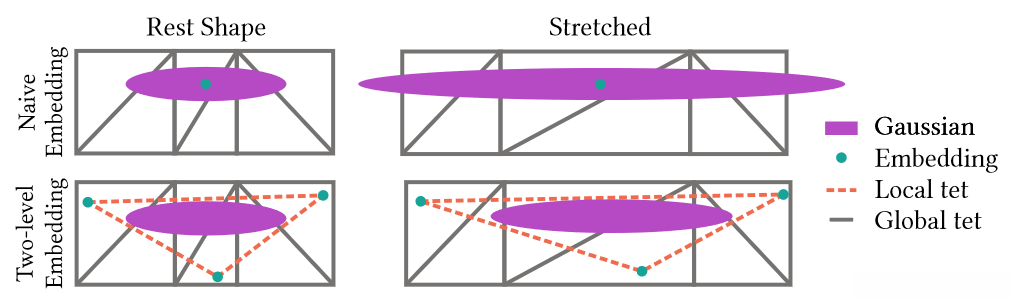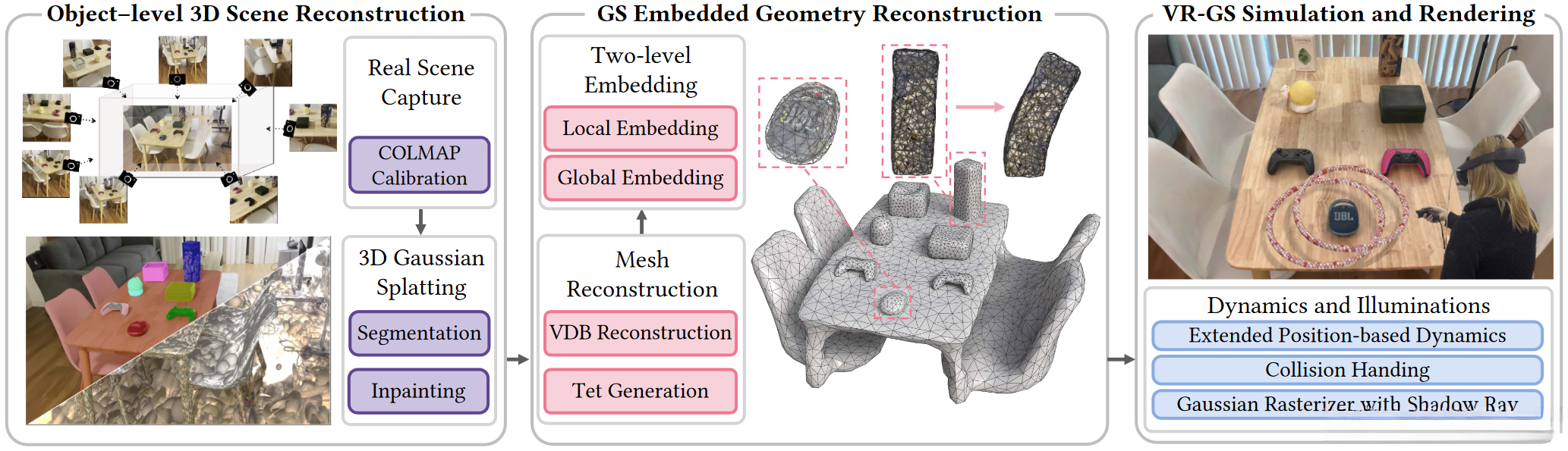 VR-GS further adopts this new type of two-level Gaussian embedding, XPBD, collision detection, and shadow casting techniques; all working together to achieve a captivating and immersive user experience.