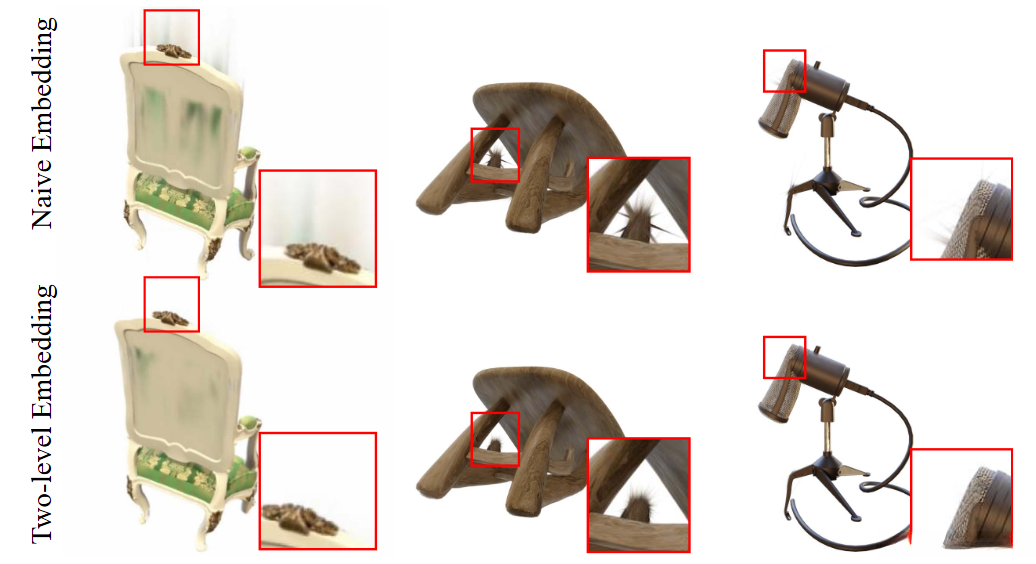Our two-level embedding effectively resolves spiky artifacts.