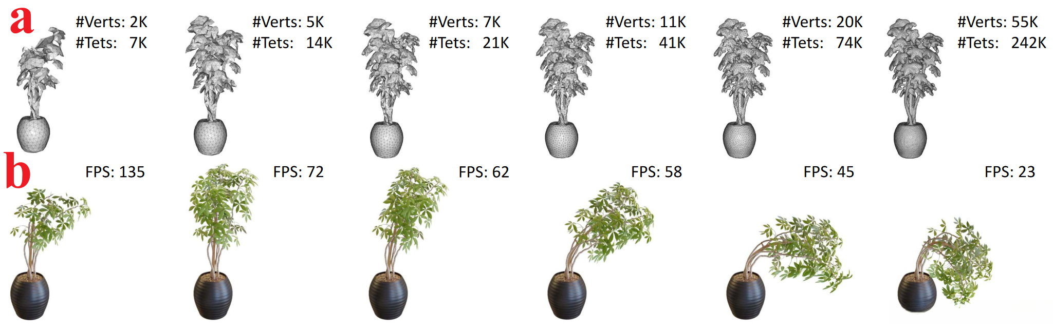 We utilize intermediate resolution meshes in practice, aiming to strike an ideal balance between high framerates and realistic physical dynamics.