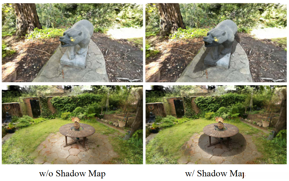 GS traditionally represents shadows as stationary exterior textures. Our innovative method, employing advanced techniques like shadow mapping, effectively creates highly dynamic and realistic shadows.