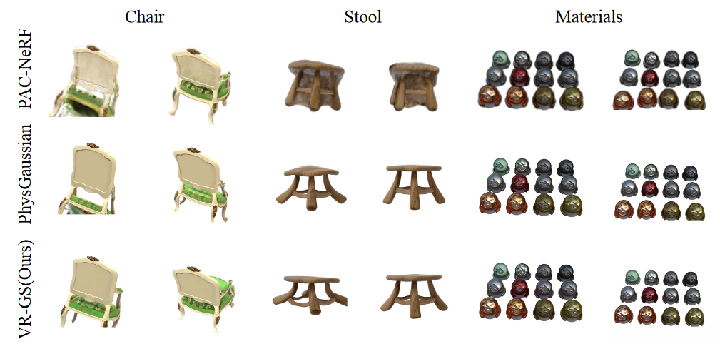 Our method achieves competitive visual results by competing with PhysGuassian and substantially surpassesPAC-NeRF.