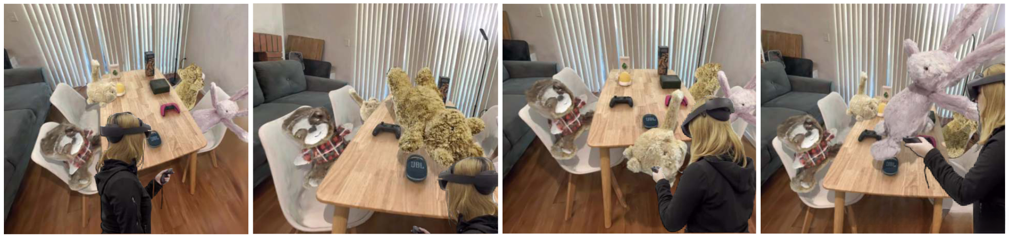 (b) Physics-based interaction enhances immersion and realism in editing, whereas transform-based interaction led to less realistic outcomes, for instance, an undeformed and penetrated toy.