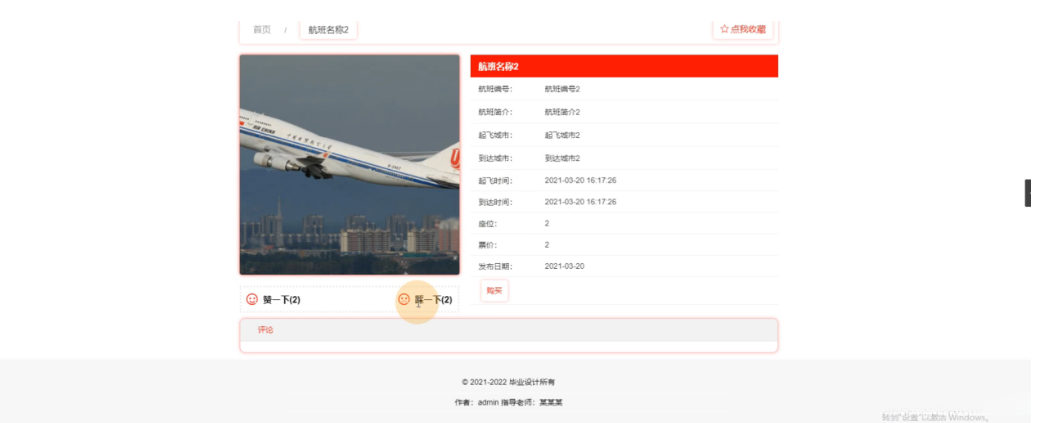 航班信息,在航班信息页面可以查看航班编号、航班名称、航班简介、起飞城市、到达城市、航班图片、起飞时间、到达时间、座位、票价、发布日期等信息,进行购买,如图4-3所示。