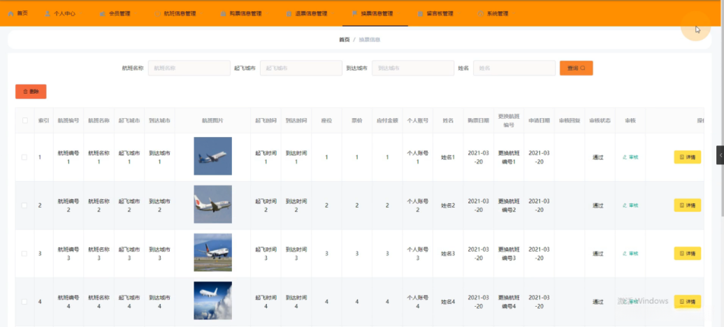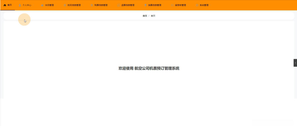 管理员管理功能:首页、个人中心、会员管理、航班信息管理、购票信息管理、退票信息管理、换票信息管理、留言板管理、系统管理等。