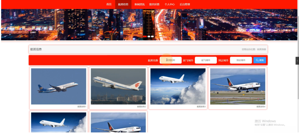 航空公司机票预订管理系统,在系统首页可以查看首页、航班信息、新闻资讯、留言反馈、个人中心、后台管理等内容,如图4-1所示。