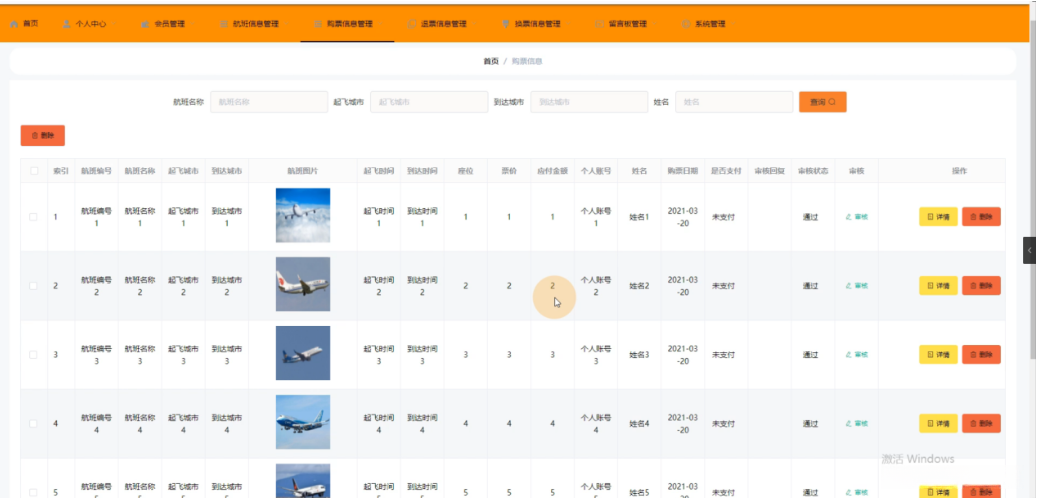 购票信息管理,在购票信息管理页面中可以查看索引、航班编号、航班名称、起飞城市、到达城市、航班图片、起飞时间、到达时间、座位、票价、应付金额、个人账号、姓名、购票日期、是否支付、审核回复、审核状态、审核等信息,并可根据需要进行删除等操作,如图4-10所示。