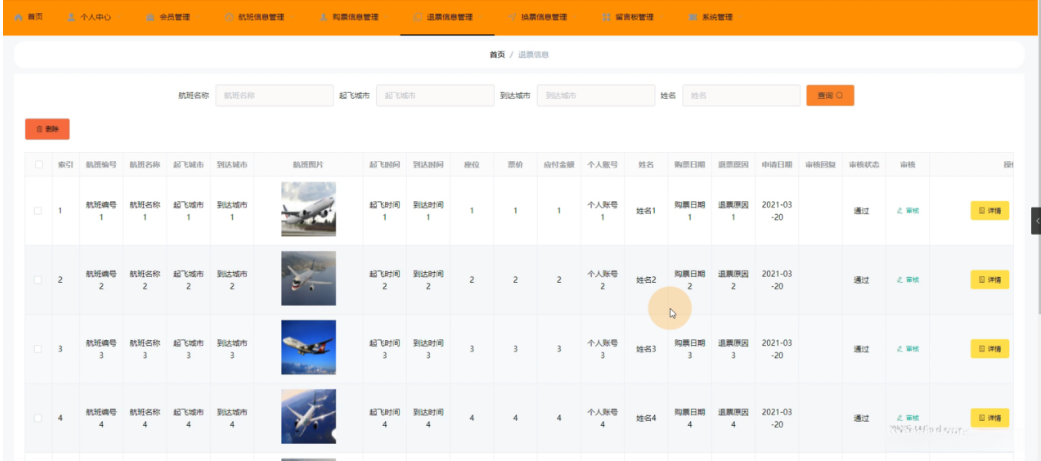 退票信息管理,在退票信息管理页面中可以查看索引、航班编号、航班名称、起飞城市、到达城市、航班图片、起飞时间、到达时间、座位、票价、应付金额、个人账号、姓名、购票日期、退票原因、申请日期、审核回复、审核状态、审核等信息,如图4-11所示。