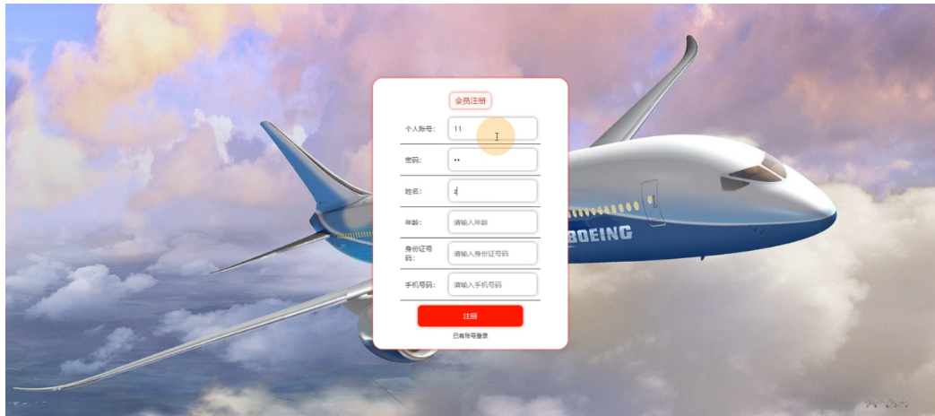 会员注册,在会员注册页面通过填写个人账号、密码、姓名、年龄、身份证号码、手机号码等信息完成会员注册,如图4-2所示。