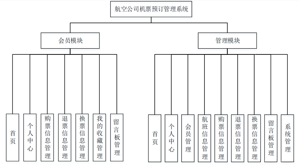 这些功能可以充分满足航空公司机票预订管理系统的需求。此系统功能较为全面如下图系统功能结构如图3-3所示。