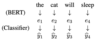之后实验获取 BERT 每一层的 embedding,每一层都训练一个简单的分类器,这样每个 token 都有一个结果(如下图)。label 是一个 one-hot 向量,使用交叉熵作为损失函数。