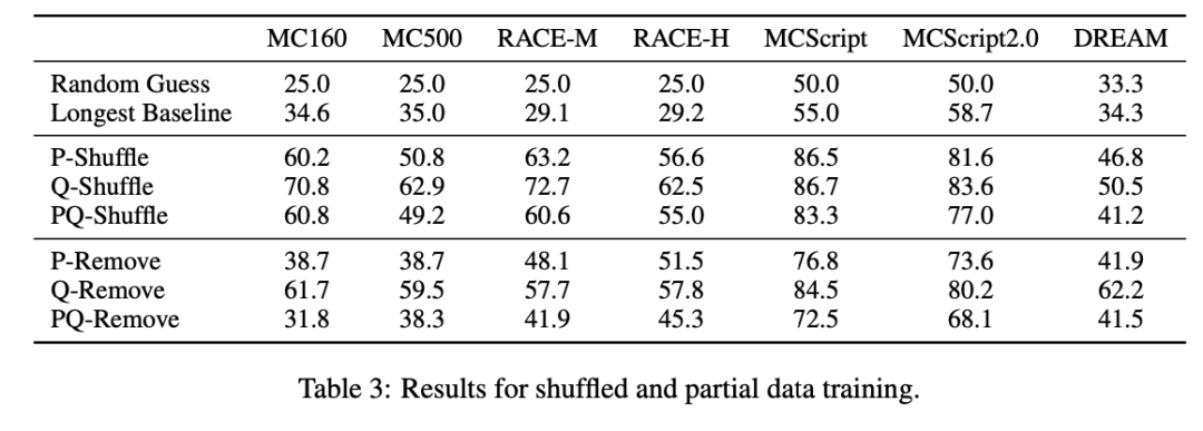作者同样尝试了删除整个 passage (P-Remove),删除整个 question (Q-Remove) 以及删除 passage 和 question (PQ-Remove)。