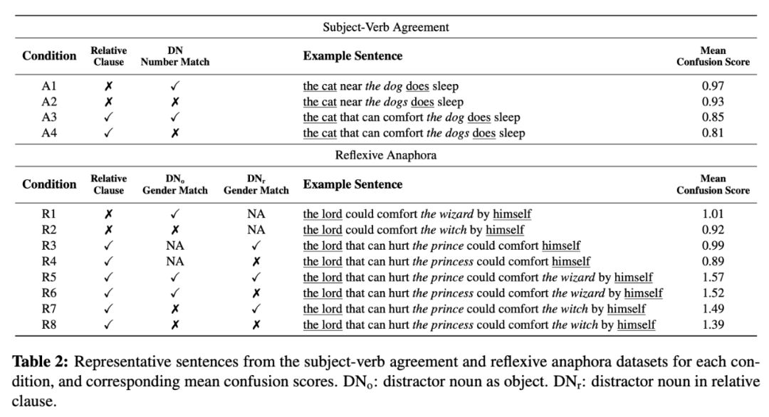 A1 和 A2 是带有介词短语的 example,A3 和 A4 是带有关系从句的 example,有论文指出带有介词短语的句子要比带有关系从句的句子更难处理,因此 A1 和 A2 的 score 要更高,而 A1 和 A3 中的“dog”和“the cat”一样都是可以接“does”的,而 A2 和 A4 的“dogs”是不能接“does”的,所以 A2 和 A4 的 score 要比 A1 和 A3 低。