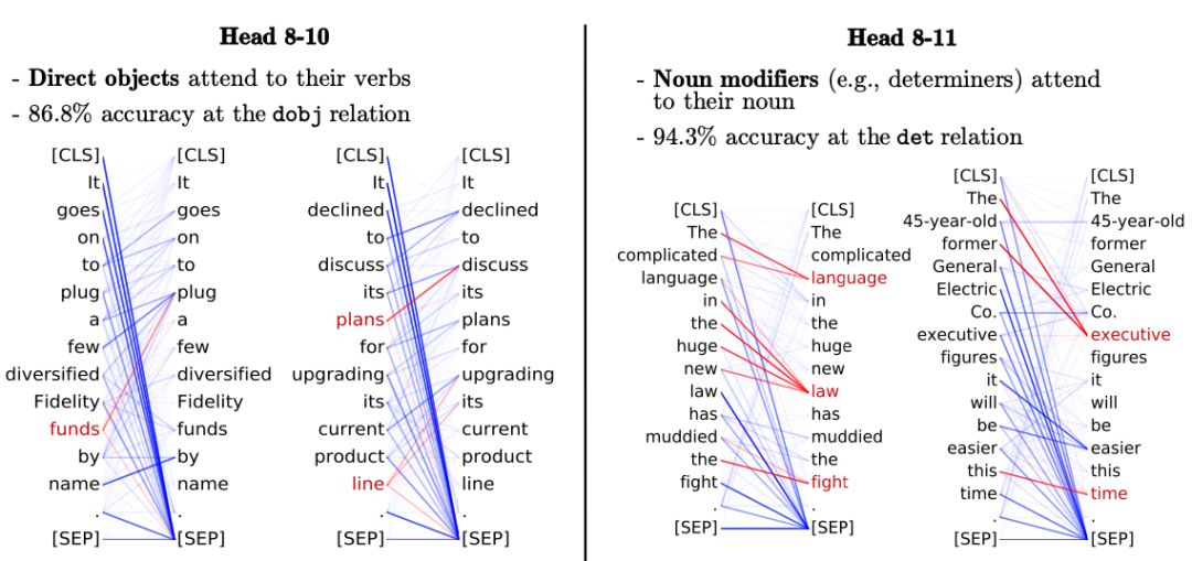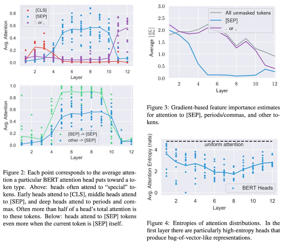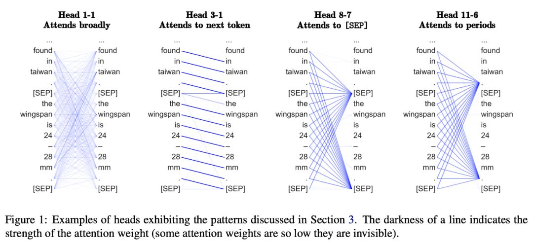 作者通过可视化 attention 的权重,得到了几种不同的 attention 的 pattern。如 Figure 1 所示,有的 attention 是 broadly 形式(关注所有的词),有的 attention 是关注的是其下一个 token,有的 attention 则集中关注 [SEP] 符号上,还有的 attention 则关注标点符号。