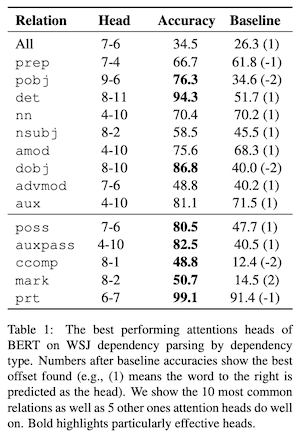 接下来作者在 Penn Tree bank 的数据集上做了统计,每个词都有一个 dependency。为了测试 BERT 中对词与词的 dependency 的建模程度,作者直接把 attention map 拿了出来,把每个词给了最多 attention 的词作为 dependency,baseline 的话就是把括号内的数字(正数表示右边第几个词,负数则表示左边第几个词)对应的 word 作为 baseline,可以看到 BERT 还是学到了很多 dependency 的信息的。