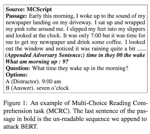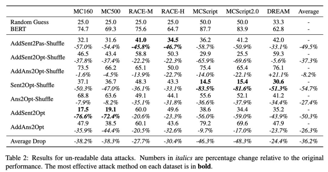 Un-Readable Data Attack(不可读数据攻击)例子,在原始的文章结尾加上一句乱序的话(这句话由原始问题和错误选项拼接而成),该方法就是 Figure 2 中的 (a)。