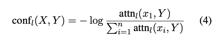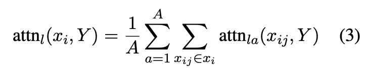 首先先计算一个 attention_score,token 可能包含多个 word(比如 Table 2 里的 the lord),相当于让每个 word 都和 Y 计算 attention,这里的 attn 函数就是 self-attention 计算的值。求和之后再在 head 层面上求和取平均,得到每个 token 对 target 的 attention。