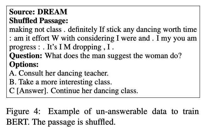 通过用不可回答的数据来训练 BERT(Un-Answerable Data Training),从这些数据中,人类可以学到一些关于如何回答问题的知识。