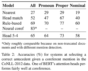 作者还做了一个共指消解的任务,在句子中找出给定词之前的 antecedent。发现某一个 head 的正确率在 65% (neural supervised model 是 83%)。