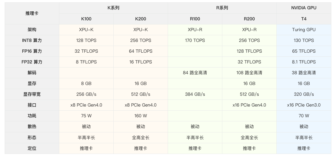 说实话,在推理卡领域昆仑芯的定位确实存在明显的混乱感。这主要体现在其R系列与K系列之间的提升幅度相对较小,缺乏明显的代际差距。即便是在当前市场环境下(2023年),昆仑芯仍然停留在K200一代的水平。对于K系列芯片来说,K100确实相当于T4级别的存在(除了产品形态上的差异)。然而在一些文章中,人们倾向于将K200与英伟达的T4(以及类似的产品如昇腾300)进行对比,这种做法并不科学,因为从能效比角度来看, K200属于全高全长卡,而T4等芯片则是半高半长卡,二者不在同一量级上进行比较。如果硬要进行横向比较,或许可以用"T4×2"或"昇腾300×2"来作为参照指标,或者直接选择K100芯片作为对比对象会更加合理一些