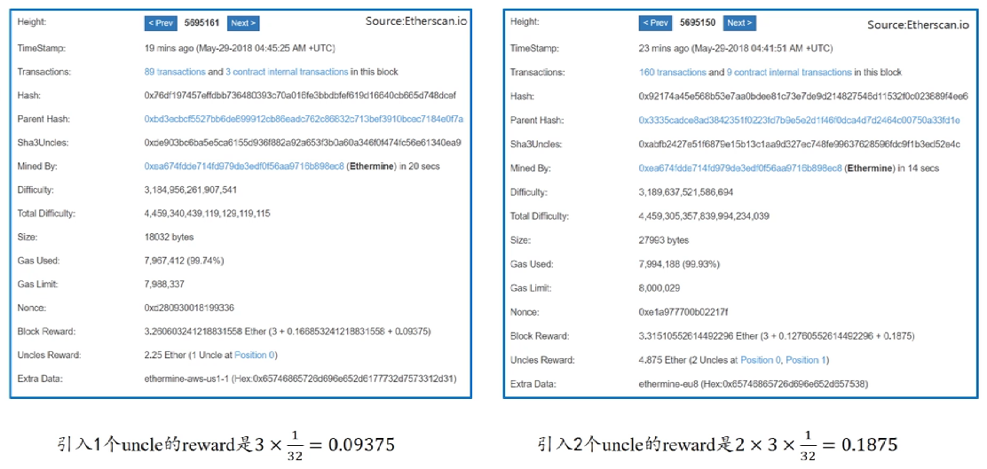 左侧:观察Block Reward时发现左侧添加了0.09375。这表明该区块引入了一个祖父级块,并使相应的祖父级块获得了2.25个Ether的奖励。这表明相隔两个世代。