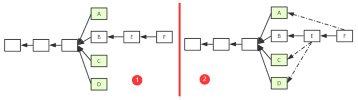 如图所示, 1是对上文示例的一个补充说明, 其中F是E之后新增的一个区块段. 由于规定E最多只能包含两个叔父级区块段, 因此我们假设E已经包含了C和D两个叔父级区块段. 此时, F也可以将A视为自身的叔父级块(实际属于祖父辈, 而非叔父辈). 若继续向下挖掘,F后续新增的区块段仍可包含B同辈级别的块(假定当前未完成对E、F的所有层级覆盖). 这样一来, 就完美地解决了原始Ghost协议版本存在的缺陷问题.
