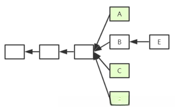 由于叔父区块最多只能容纳两个, 如图所示出现三个该怎么办?或者自己的块E已经发布完毕, 然后才收到叔父块, 已经来不及处理了, 那么这个新接收到的块(A或C或D)则被视为废弃的块