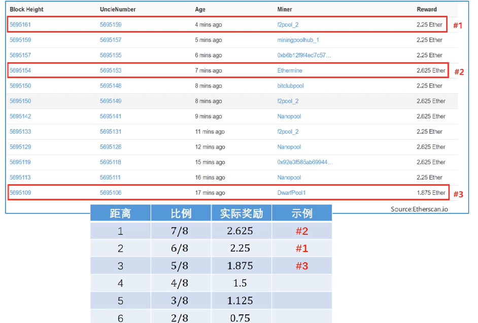 这里涉及的是叔父区块的情形,在表格中有一列称为Block Height代表各个区块的顺序编号。查看编号为#1的情况时会发现其顺序编号比对应的UncleNumber少两个单位,并相隔两个世代的时间差值后将会有6/8比例的区块给予额外奖励。举例来说,在某个案例中获得出块奖励为3个ETH那么计算得出每次出块可获得3乘以6除以8等于2.25 ETH的具体数值结果。其他情况也是类似的操作流程
