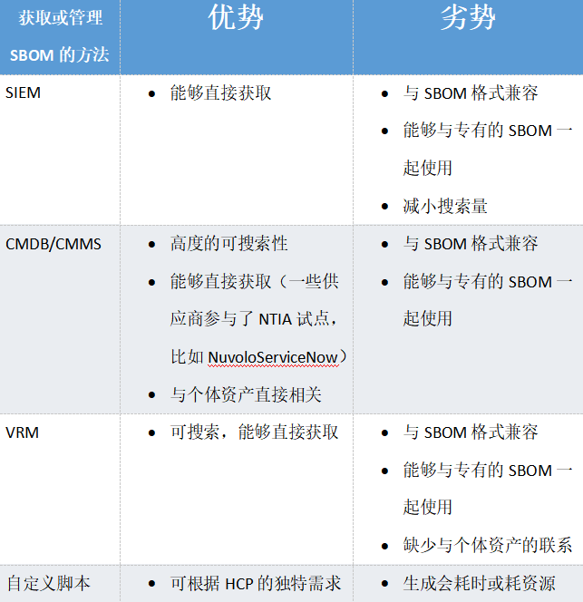 该表格概述了HCP在获取与管理SBOM过程中可能采用的方法及其优缺点。