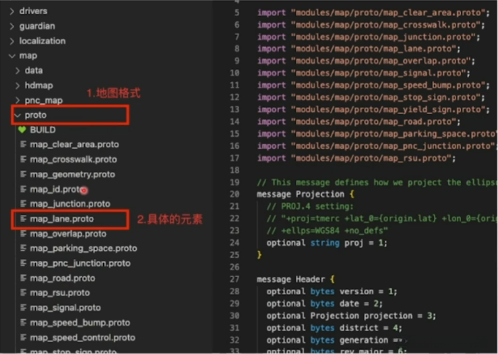 Apollo高精度地图通过proto定义,每个proto代表一种地图元素,如下图所示: