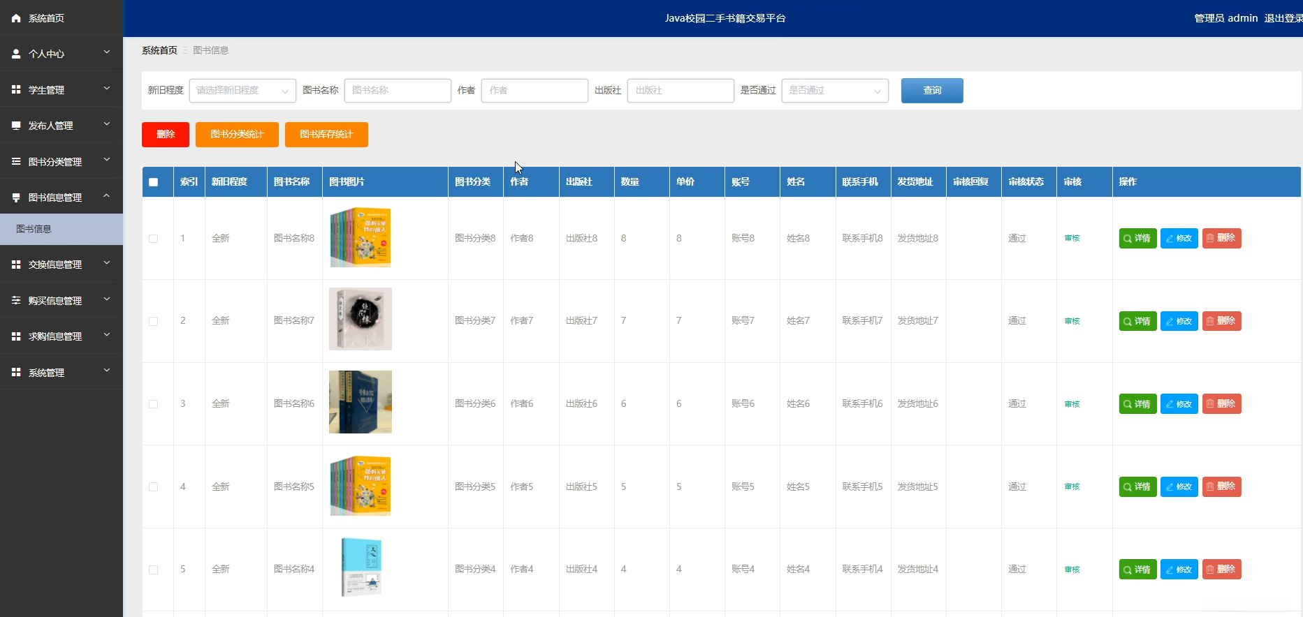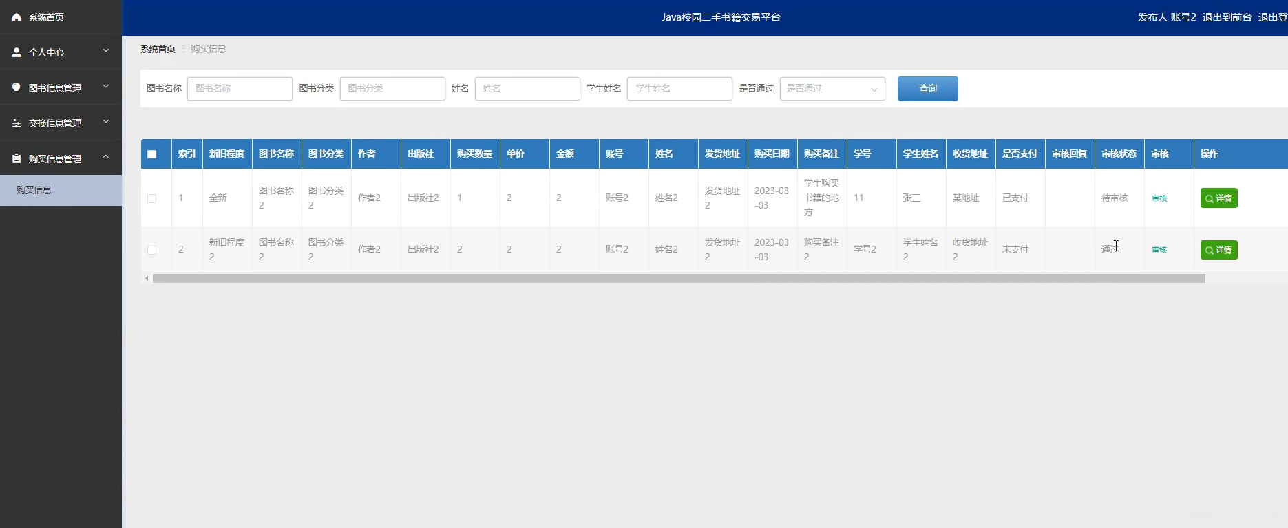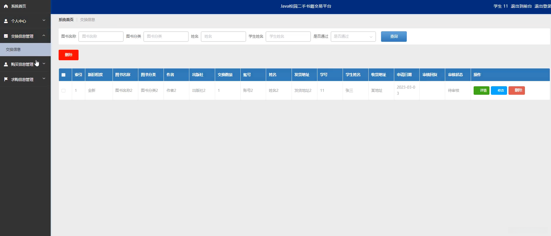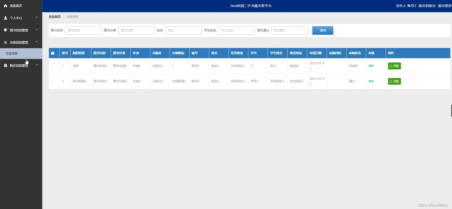 研究目的: 本研究的目的是设计并实现一个校园二手书籍交易平台,通过提供学生、图书分类、发布人、图书信息、交换信息、购买信息、求购信息等功能,解决现有平台存在的问题,提高交易效率和安全性。具体目标包括:1)设计用户友好的界面,方便学生进行书籍发布、浏览和交易;2)建立完善的图书分类体系,方便学生快速找到所需书籍;3)提供安全可靠的交易机制,保障交易双方的权益;4)收集和分析用户反馈,不断优化平台功能和用户体验。