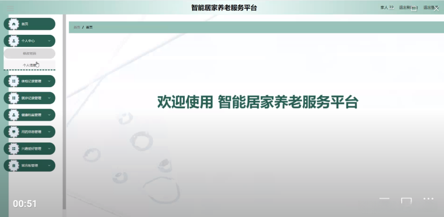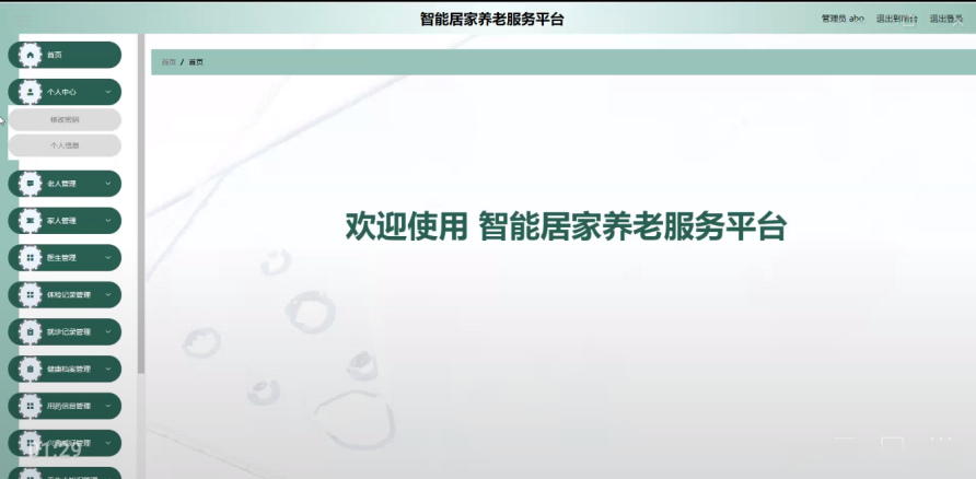 管理员登录系统后,可以对首页,个人中心,家人管理,老人管理,医生管理,体检记录管理,就诊记录管理,健康档案管理,用药信息管理,兴趣爱好管理,养生小知识管理,养老政策管理,留言板管理,系统管理等功能进行相应操作,如图5-7所示。