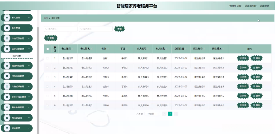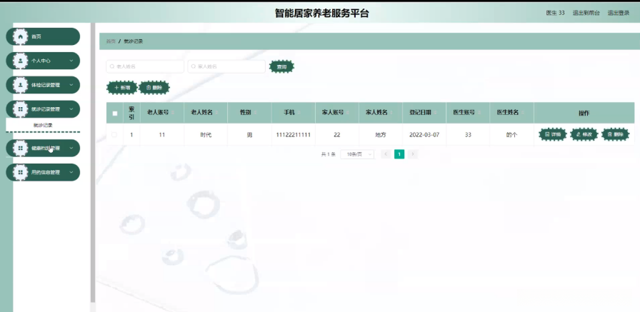 就诊记录管理;在就诊记录管理页面可以对老人账号,老人姓名,性别,手机,家人账号,家人姓名,登记日期,医生账号,医生姓名等内容进行详情或删除等操作,如图5-11所示。