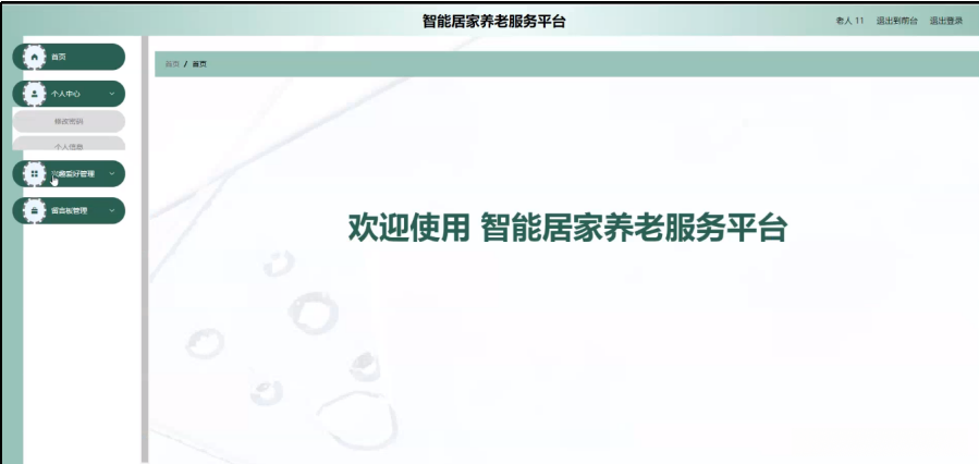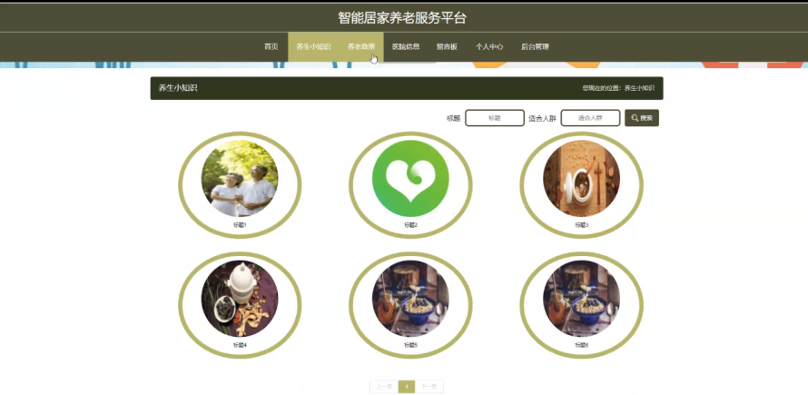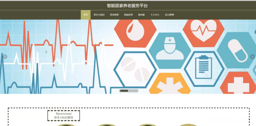智能居家养老服务平台;在网站首页可以查看首页,养生小知识,养老政策,医院信息,留言板,个人中心,后台管理等内容进行详细操作,如图5-3所示。