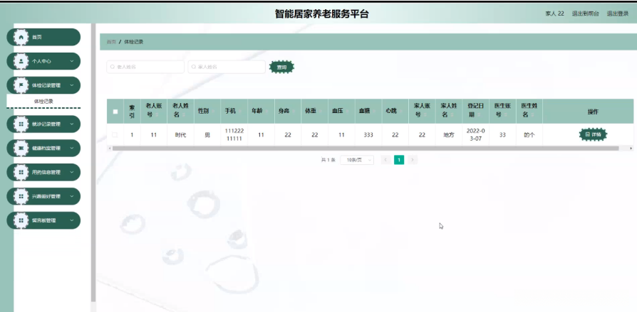 体检记录管理;在体检记录管理页面可以对老人账号,老人姓名,性别,手机,年龄,身高,体重,血压,血糖,心跳等内容进行详情操作,如图5-14所示。