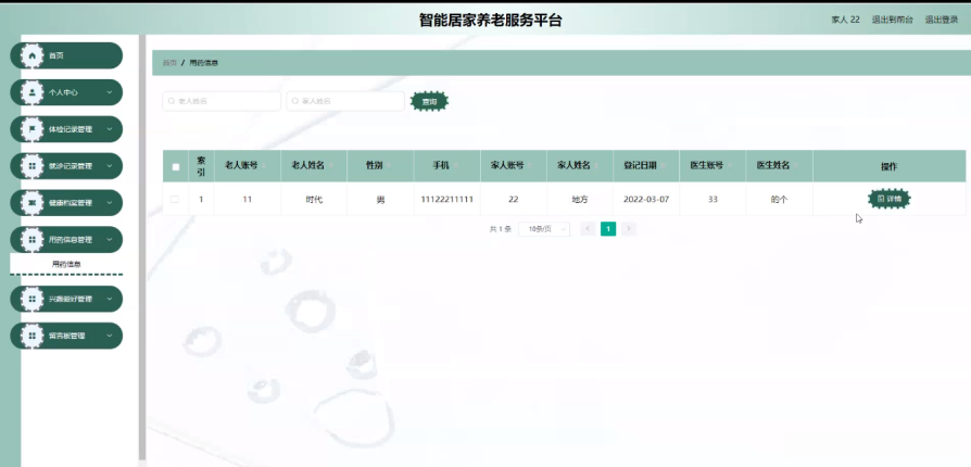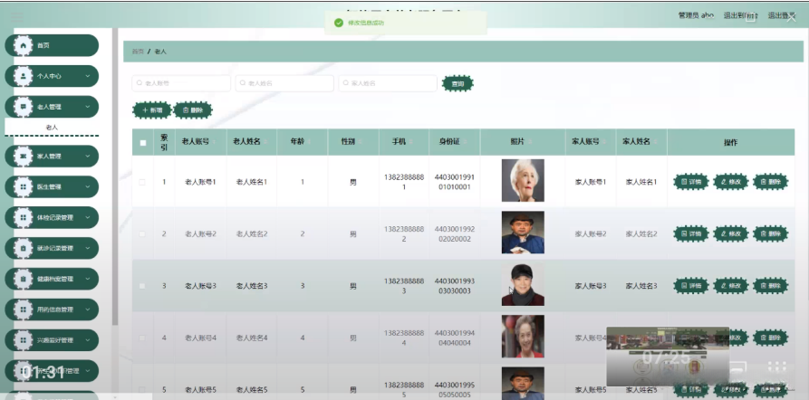 家人管理;在家人管理页面可以对老人账号,老人姓名,年龄,性别,手机,身份证,照片,家人账号,家人姓名等内容进行详情,修改或删除等操作,如图5-9所示。