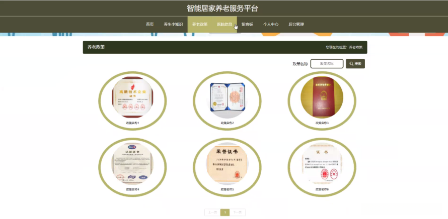 养老政策;在养老政策页面可以查看政策名称,政策内容等内容,如图5-6所示。
