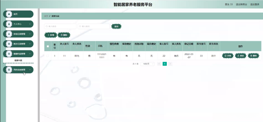 健康档案管理;在健康档案管理页面可以对老人账号,老人姓名,性别,手机,慢性疾病,家族病史,药物过敏,既往病史,家人账号,家人姓名,登记日期等内容进行详情,修改和删除操作,如图5-20所示。