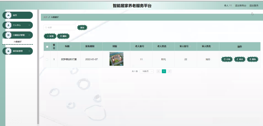 兴趣爱好管理;在兴趣爱好管理页面可以对标题,发布时间,封面,老人账号,老人姓名,家人账号,家人姓名等内容进行详情,修改和删除操作,如图5-17所示。