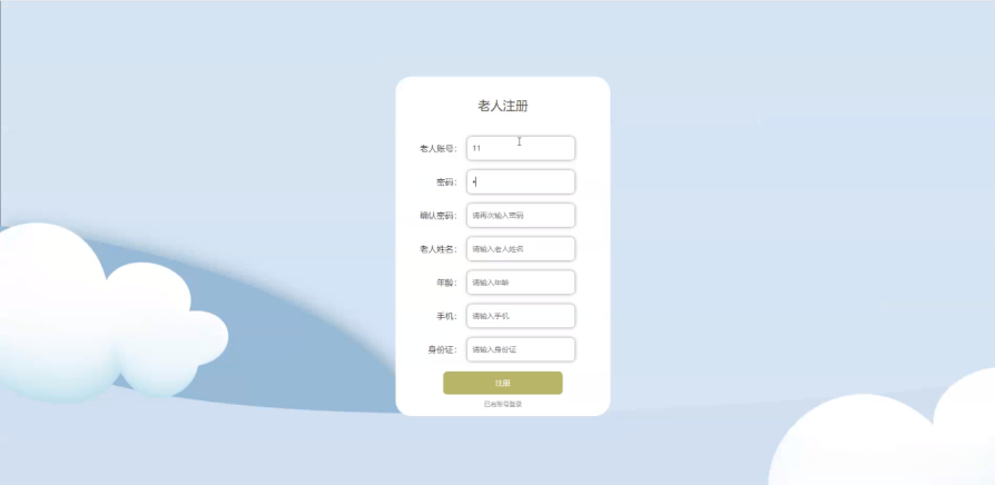 老人注册;在老人注册页面通过填写老人账号,密码,确认密码,老人姓名,年龄,手机,身份证等信息完成老人注册操作,如图5-4所示。