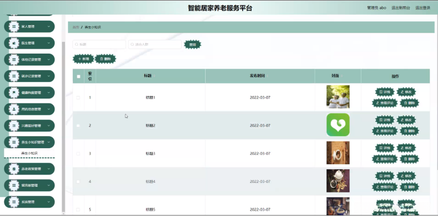 养生小知识管理;在养生小知识管理页面可以对标题,发布时间,封面等内容进行详情,修改,查看评论或删除等操作,如图5-12所示。
