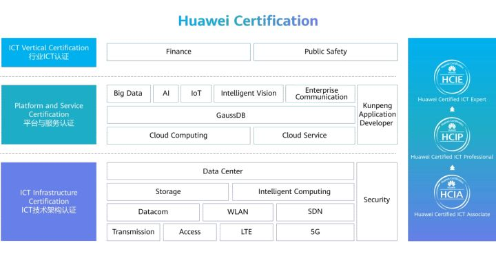 华为致力于构建涵盖广泛领域的行业级IT认证体系,在围绕"云-管-端"协同的新ICT技术架构上进行聚焦这一新兴的技术架构,并通过包含三个主要类别来实现对不同行业的覆盖