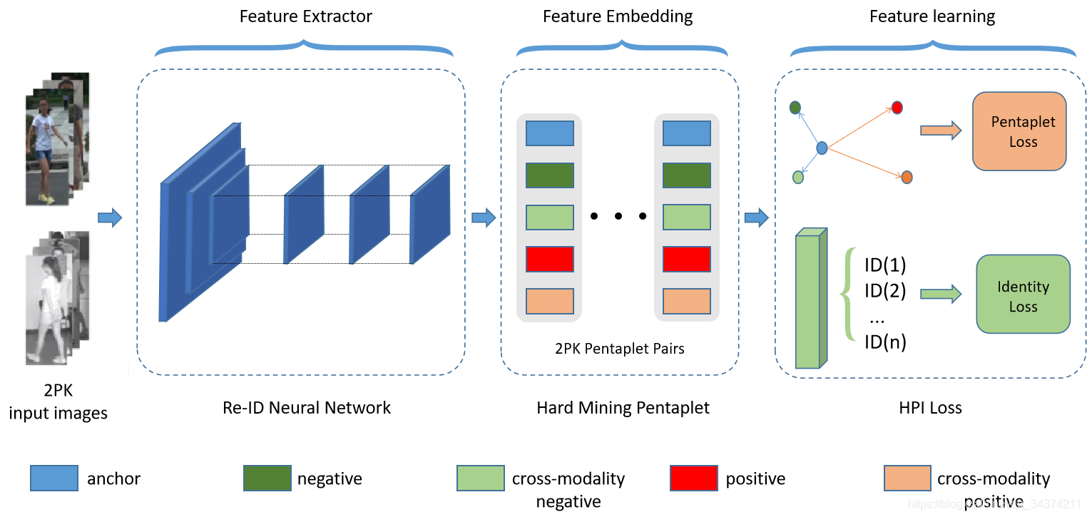 - 设计了一种新的损失函数:hard pentaplet loss,它可以有效处理RGB-IR Re-ID中的跨模态变化和内模态变化。此外,hard pentaplet loss和identity loss相结合可达到更高的精度。