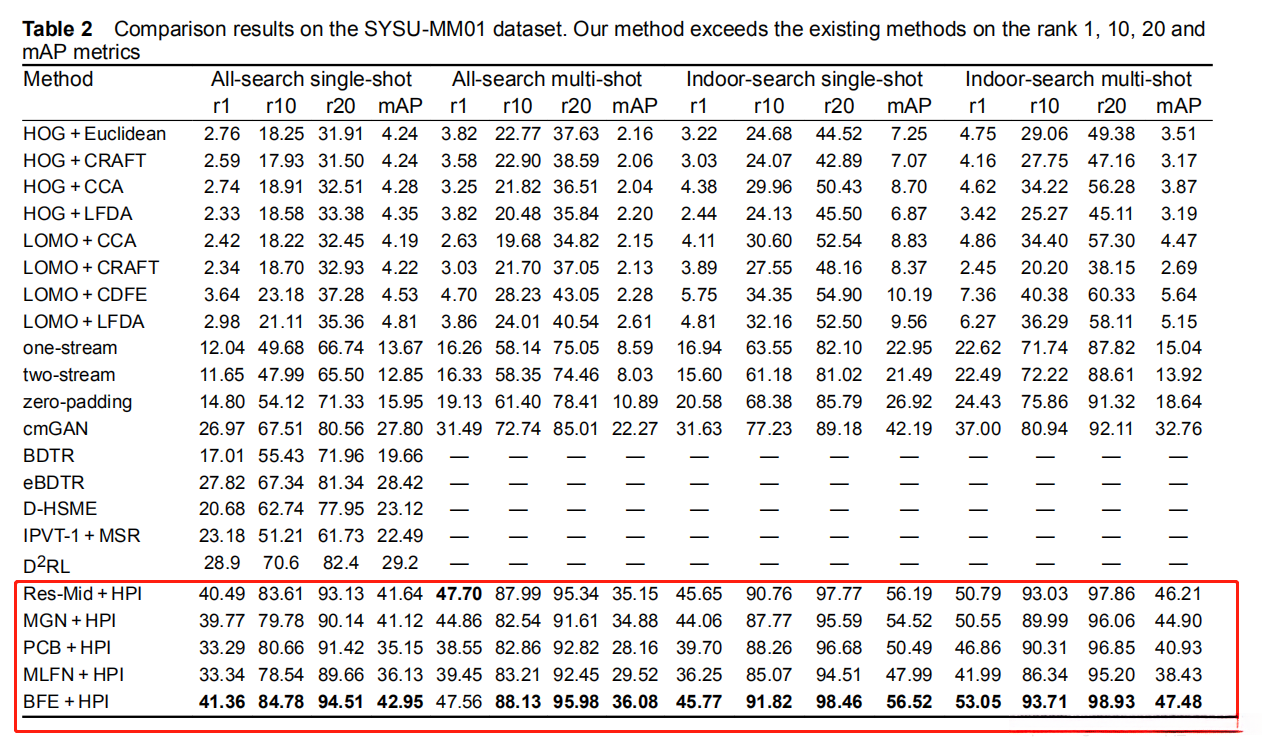- 提出了一个端对端的特征学习框架,在RGB-IR Re-ID数据集SYSU-MM01上达到了最高的精度。